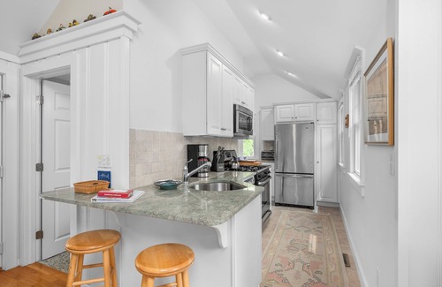 Michelle Sylvia rental collection home. This is the most charming and updated cottage in the "village" that you will find! Just 1 block to all Osterville shops and restaurants. This stunning two bedroom gem is totally turnkey with custom and designer details throughout. The pictures say it all! central air, gas fireplace, hardwood floors, vaulted ceilings, granite countertops, stainless steel appliances, and dining deck in rear. The perfect village location. Short bike ride to Dowses Beach. Pets are not allowed.