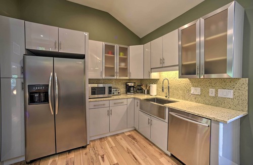 KITCHEN: Fully equipped w/ stainless steel appliances, granite countertops, dishwasher, island w/ seating, stainless steel farmhouse sink, toaster, drip coffee maker, dishware/flatware