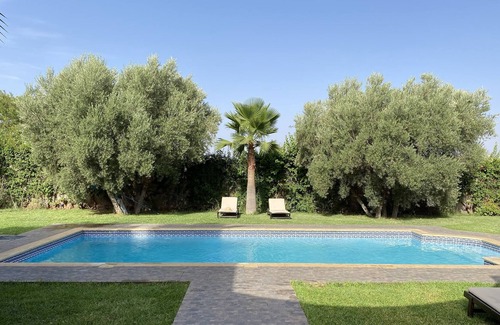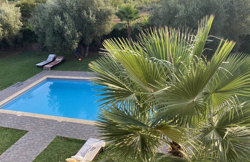 You will stay in a house of 150 m² decorated, with 3 air-conditioned bedrooms, 1 with 2 twin beds, 3 bathrooms, 1 large lounge with TV, dvd, satellite, overlooking the terrace, large kitchen, all on a garden of 4500 m² with its private pool. Permanent surveillance is provided by a couple of guards living in a small house at the entrance of the property and two dogs. Only 25 minutes on the tourist route of Ourika, the center of Marrakech, and 15 minutes from the shopping center Almazar Carrefour, cinema, disco, bowling ...