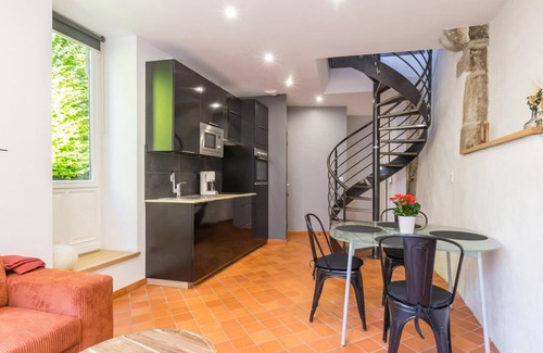In the historic center, independent duplex apartment. Living room with equipped kitchenette (oven, microwave, extractor fan, dishwasher), shower room and toilet. Upstairs, the mezzanine bedroom (1 bed 140X190) gives access to the large private terrace. TV. Wi-Fi internet. Washing machine. Electric heating included. All charges included (excluding electric vehicle charging, gîte not suitable). Sheets and towels provided. Beds made upon arrival. Cleaning service included. Private enclosed terrace on the 1st floor. Garden furniture. Deckchairs. No private parking, free parking on public square 50m away. Not suitable for small children. No smoking. This charming address, ideal for 2 people, is in the medieval heart of Avranches. Nestled behind the municipal museum, it is perfectly located to enjoy both the shops of the city center (less than 300m) and the picturesque old quarters. At the end of the alley, Thomas Becket Square is a haven of peace and offers an exceptional panorama of the bay! You can also discover the unique Scriptorial Museum, where the manuscripts of the Mont are preserved. Formerly a house painter's studio, this space has been superbly renovated into a two-story apartment. Featuring both traditional materials (plaster, terracotta tiles) and more contemporary ones, such as the beautiful metal staircase, it's a truly cozy nest for your vacation in a peaceful alleyway in the heart of the city. Anne-Claire will be happy to welcome you. You'll just have to be brave enough to leave the large south-facing terrace upstairs!