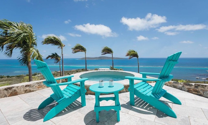 The salt water plunge pool has an interior bench overlooking the Caribbean Sea and Buck Island. The pool is private and shared with the owners when they are on Island and in residence in the upper level of the home.