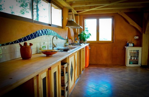 The nid des Anges is a bioclimatic house that was constructed with natural material (wood, straw, clay). It is big and very comfortable. Its total surface is 240 sq.m, which are divided into 2 floors so it is possible to host up to 15 people (with extra bedding for 3 people). The price per weekend is 800€. Each room of the house has one specific characteristic: 1 big fully equipped kitchen which is open to the dining room and the living room, 2 relaxation areas in front of the fireplace or nature, 1 sound space for your relaxation, 1 reading and game area, 4 bedrooms, 2 bathrooms, 1 terrace for sunbathing, 1 terrace to have your meals at, several terraces for relaxation around the house, a big garden of 1000 sq.m, a Jacuzzi, a Gaveau upright piano, and barbecue.