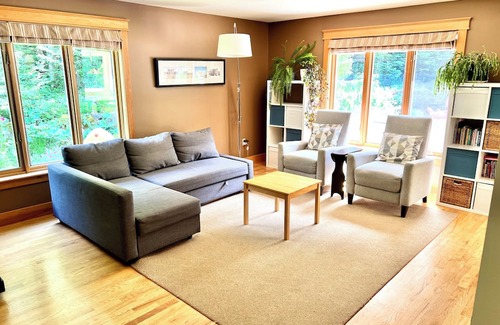 There are two inviting living rooms, separated by a glass pocket door for added privacy if additional sleeping space is needed. These rooms are flooded with natural light and only trees can be seen from all of the large windows. The family room couch pulls out into a double bed, and we provide an inflatable queen mattress which fits comfortably in the second living room. You're welcome to use your Netflix, Crave, Prime TV or Disney+ accounts on the TV, but please do not use the fireplace.