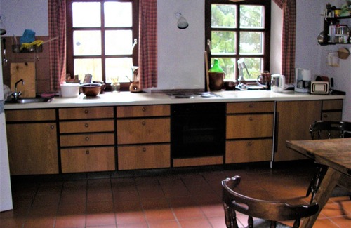 Along the house, right through the front door, we enter the original hallway. To the right up the stairs is the bedrooms. Straight ahead, however, is the former milk chamber, converted into a bathroom with a toilet. There is also a washing machine and dryer. The trap door next to it leads into the small, cool basement. On the left we get into the large kitchen. They have all the support of a modern, fully equipped household, such as: B. Dishwasher, refrigerator, electric stove, coffee machine, electric hand mixer and bread slicer. Of course you can also cook on the old wood stove, like the former farmers. A small dining table for 6 people or the large dining table for up to 12 people are available with all the necessary crockery and cutlery. Opposite the kitchen door - across the hallway - you will reach the former stable. Get used to the fact that you may be allowed to sleep in the 'pigsty' or read an exciting book in the 'cowshed'. Opposite the 'cowshed' is the storage and electrical room. The whole house is equipped with a convenient night storage heater.