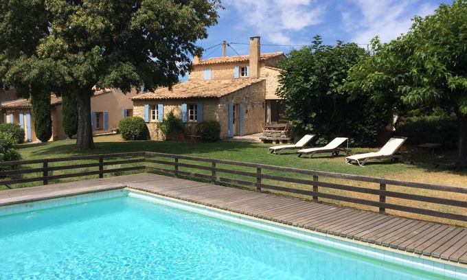 You can't help but fall in love with Le Mas des Anges! An ideal place for 2 families or larger groups, Le Mas des Anges is a beautifully restored Provencal farmhouse in the heart of the Luberon. It has a very large garden, a beautiful pool and the most stunning views across the Luberon mountains. Ideally located amongst the lavender, olive groves and vineyards, and yet only 5 minutes from both the gorgeous hilltop village of Saignon and the charming town of Apt with its famous market and all amenities. The famous villages of Bonnieux, Gordes, Menerbes, and Roussillon are all within 10 to 20 minutes drive. Colorado de Rustrel is at a walking distance. You will be spoilt for choices of places to wine and dine, and for the more active there's lots to do.