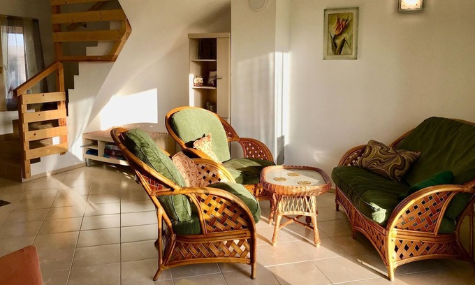 Layout: Ground floor: (Living room(single sofa bed, dining table, seating area), open kitchen(hob, electric kettle, toaster, hood, microwave, fridge-freezer, washing machine), bathroom(shower, washbasin, toilet)) On the 1st floor: (bedroom(double bed), bedroom(single folding bed, single sofa bed), bathroom(shower, washbasin, toilet)) grill, heating, air conditioning, terrace, garden, garden furniture, parking, iron