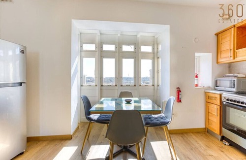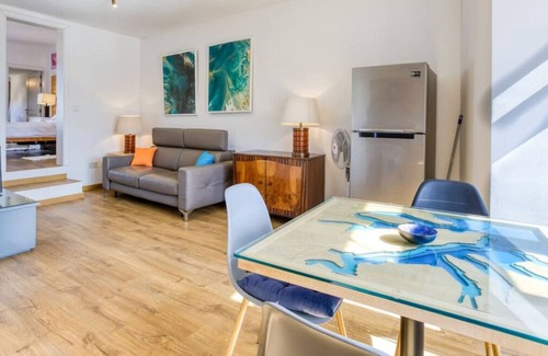 The apartment boasts a cozy living, dining, and kitchen area, perfect for relaxing after a day of exploring the city's rich heritage.