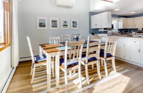 Step inside to discover spacious living areas designed for relaxation and entertainment. The inviting living room features a comfy couch and a 55” HDTV with cable and Netflix, perfect for cozy movie nights. Adjacent to this is a sunroom filled with natural light, where you can unwind with a good book while catching glimpses of the water. The well-stocked kitchen is a chef's delight, equipped with modern appliances and ample counter space, making it easy to prepare delicious meals for your group. Gather around the large dining table that seats eight, where you can enjoy meals with a view of the ocean.