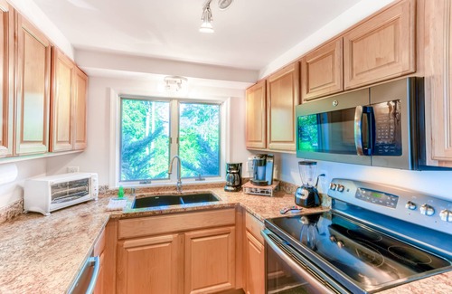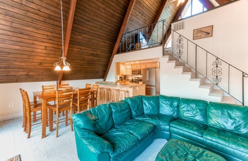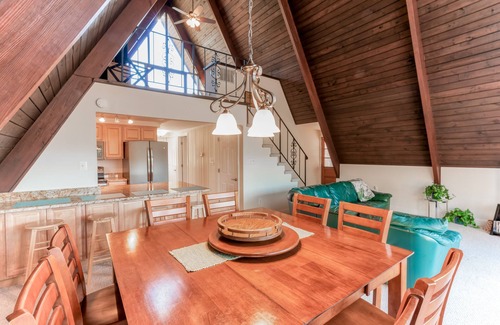 This bright and inviting A-frame features an updated full kitchen with recently serviced appliances including a new dishwasher, new pots and pans, helpful extras like a Keurig coffee maker, a breakfast bar, and a dining table for everyone (perfect for family meals or family game nights). The cozy living area features cathedral ceilings, a large sectional sofa, a TV with streaming services, and easy sliding door access out to the furnished deck. Downstairs, this home also includes a ground-level game room with a full-size pool table that opens out to the backyard. No matter where you choose to relax, know the central air-conditioning will keep you cool. When it's time to wind down for the night, rest blissfully in the beds, all of which feature new mattresses and new mattress tops to increase comfort.