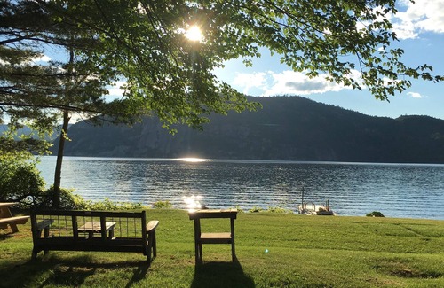 Enjoy our waterfront cabin located on the east side of Lake George with views of Roger's Rock. We are located 1 mile from the public boat launch, Snug Harbor Marina, and the local beach. We are located 5 minutes from the center of Ticonderoga and only a few miles from Lake Champlain. Experience the beautiful sunsets while eating in our screened in porch. The cabin sleeps 10 comfortably with 1 1/2 baths. We also have all the modern conveniences needed to enjoy a short or long stay at the lake. Our cabin has a 20 ft dock and mooring plus we have plenty of lawn furniture to sit back and watch the beauty of the Adirondacks or your guests playing in the water.