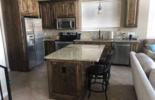 This charming lakefront home has one bedroom, one bathroom and a spacious loft upstairs. The kitchen includes granite countertops, stainless steel appliances plus a large kitchen island with two barstools. The kitchen is fully equipped for all of your cooking needs. The bathroom includes granite countertops and a garden tub. The home includes free WiFi and satellite TV. Some of the best features of this home are the two spacious decks that face the lake. The decks face the east so they are shaded in the afternoon which makes for magical evenings overlooking the lake. There is always a slight breeze flowing on the decks. In addition, the home includes a fenced in backyard as well as direct access to the lake via a staircase. Please note the path to the lake is a fairly steep climb so it is not advisable for handicapped individuals. In addition, it is required to climb stairs to enter the home from the driveway.