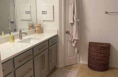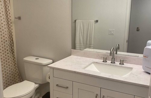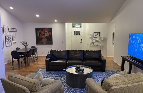 Large open living room for socializing/dining together with tv and space for extra blow up mattress (+2). Kitchen features quartz countertops, brand new cabinets and hardware. Kitchen has breakfast nook right off the kitchen to socialize while you entertain. Three bedrooms off the living room with queen mattresses.