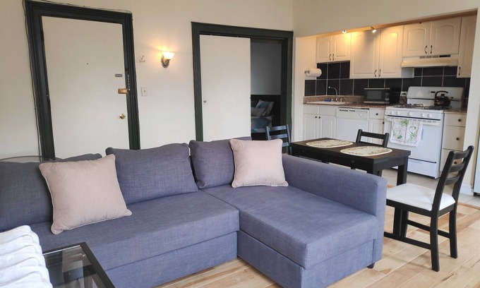 The apartment itself is a quiet and private one bedroom third floor walk-up, located in a secure brownstone with just three other apartments in the building. Oversized windows bathe your fully equipped kitchen and living room with bright light. You will have all you need to make a delicious meal from home. The living room is equipped with a comfy sleeper sofa, smart TV and kitchenette table. The bedroom has plenty of closet and dresser space and a queen size bed. Off of the bedroom is a full bathroom with combo shower/tub and your own washer/dryer in the apartment. Whether a travel nurse, MICA, Hopkins or UB student or professor, explorer or just here for fun and loved ones - we think you’ll love life in Bolton Hill in this comfortable one bedroom apartment!