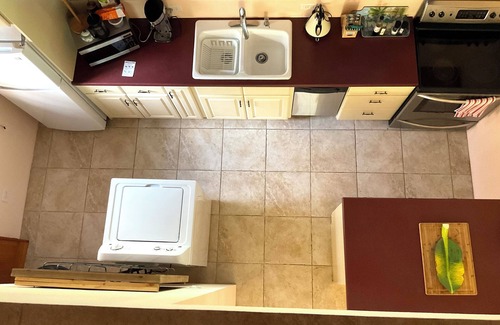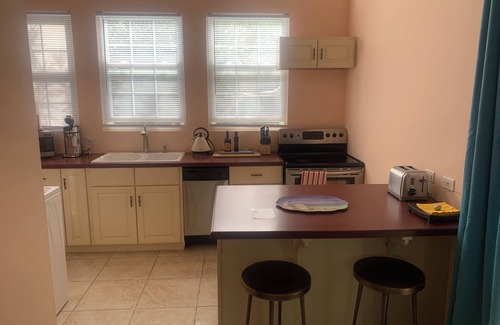 · The kitchen includes a fridge, stove, dishwasher, cooking utensils, china and cutlery so that all of your culinary skills can be experienced. There is an eat at bar with two stools for your comfort.