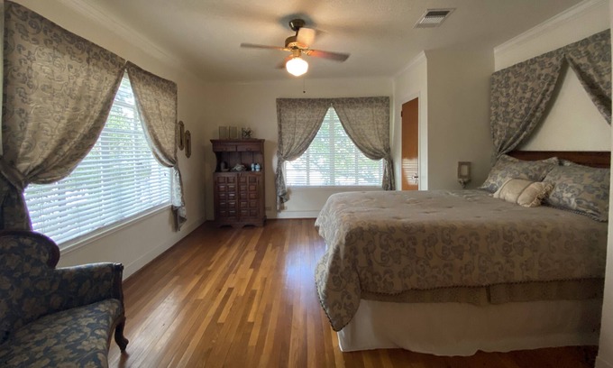 Escape to this marvelous house in picturesque Brenham. With generous sleeping accommodations including 1 king bed, 2 queen beds, 3 full beds, and 2 twin beds, there's plenty of space to relax and unwind. Park your car on premises and leave it behind as you enjoy the walking-distance proximity to historic downtown Brenham. We look forward to welcoming you to Eclect Inn!