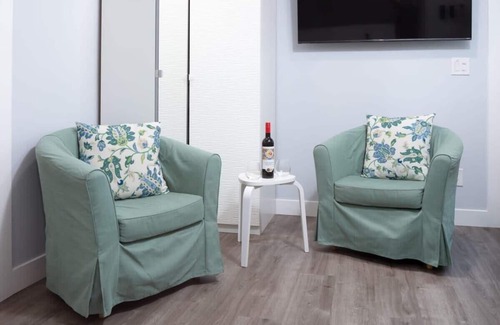 Cozy but well proportioned and set up. We have maximized the use of long marble counters that serve for food/kitchen prep but also as dining and work space. Murphy bed can be stored for more room during the day. Several chair combinations to relax, work and eat. Smart TV with YouTube TV and access to all your own accounts.