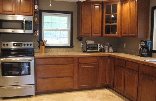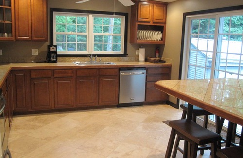 Re-Hab: The house is finished a total re-hab. We have built a brand new kitchen and turned the old kitchen into an additional bed room, now there are 4, and the living room and sun room sleeper sofas, we raised the ceiling in the living room added a wood burning stove with a stone surround. And a 54' hi-def flat screen TV. Hard Wood floors have been installed throughout. All flower bed retain walls have been rebuilt and a complete new landscape was installed.