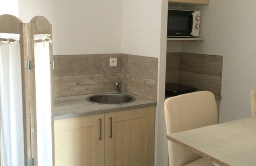 1 tv and free wifi. Small kitchen area with ovens (traditional, and microwave), induction hob, coffee maker and cutlery available. Shower room and toilet.