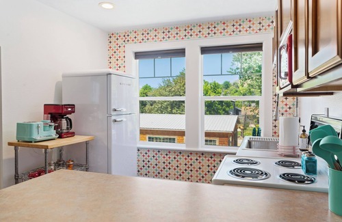 Welcome to our charming studio apartment in Boise's beautiful North End. Surrounded by trees, this cozy retreat offers a peaceful escape close to the city's vibrant offerings. Enjoy retro decor, a well-equipped kitchenette, and a comfortable bed. Easy access to hiking and biking in the nearby foothills and Greenbelt. Two cruiser bikes equipped with helmets and bike locks to use. So fun! A short drive to Bogus Basin for skiing and snowboarding. Close to downtown for dining and shopping. Perfect for active visits, family trips, or business stays.