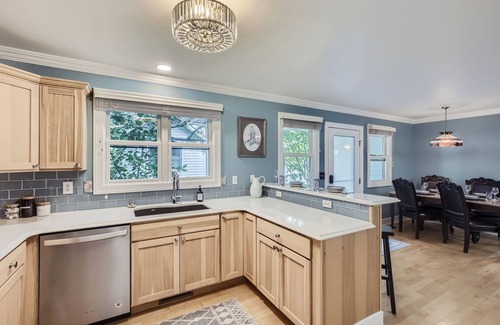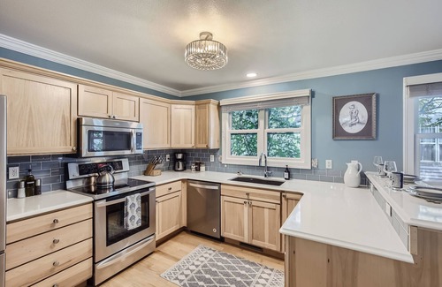 This home offers the perfect blend of modern convenience and timeless charm. Secluded on a private lot, you can start your mornings with a peaceful cup of coffee on the front porch or private patio. Inside, the main floor boasts an open-concept design with the living, dining, and kitchen areas flowing seamlessly. The main level also includes the master bedroom with a king bed, dual gas fireplace, walk in closet and a full ensuite bath. The lower level offers plenty of natural light, a second living room with 55 inch Smart TV, comfortable lounge furniture and desk for those working abroad. The lower level also includes two additional bedrooms, one with two twin xl beds and the second with a plush queen bed.