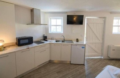 The kitchen has a fridge, a hob, an oven, a kettle, a freezer and a microwave.