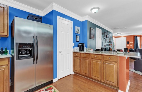 Inside you'll find a bright interior with lots of natural light, an airy feel throughout the space and a feeling of welcome. Upon entering you'll be greeted by a spacious living area, complete with comfortable furniture around the fireplace and wall-mounted TV, and plenty of board games to choose from to chalk up some friendly competition. Enjoy feasting on fantastic meals in the breakfast area with an accompanying round table. Hobby chefs will love preparing meals in the full kitchen, complete with a breakfast bar, and all the cupboard room you could ever want. Each of the bedrooms have large, soft beds and wall-mounted TVs, so nobody has to miss out on their favorite Netflix show. The main bedroom has an en-suite bathroom with a double-sink vanity, walk-in shower, and roomy soaking tub for convenience and luxury. Sip your morning coffee from the back porch sitting area and enjoy the Georgia sun rise, listening to peaceful wildlife.