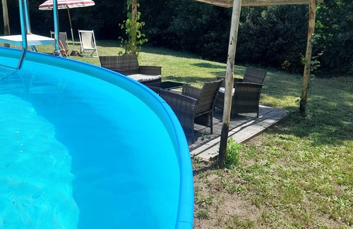 Casa Pettirosso is surrounded by a wide park of shady oaks, providing an ideal space for children to run and play safely.The whole area including woodland and garden is not fully fenced . In the garden under the oak trees there is a dining table with benches and a portable barbecue that allows you to cook outdoor. There is an elevated pool measuring 8mt in diameter and 1,20 mt deep at the exclusive use of the guests. The swimming pool area is equipped with deck chairs , sun beds,small table with sun umbrella . A large parking area is just in front of the house , very handy for carrying suitcases and luggage.