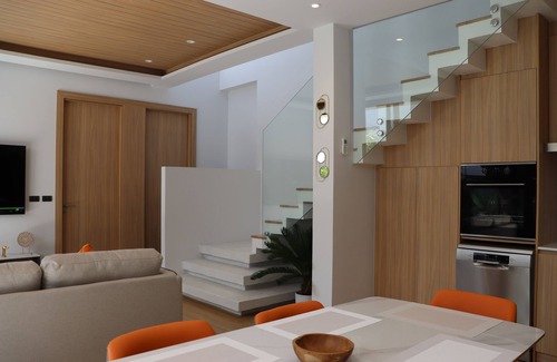 Adjacent to the kitchen, you'll find a cozy living room adorned with stylish furnishings and offering breathtaking views of the garden and pool. It's the perfect retreat for unwinding after a day of exploration or simply lounging with loved ones.