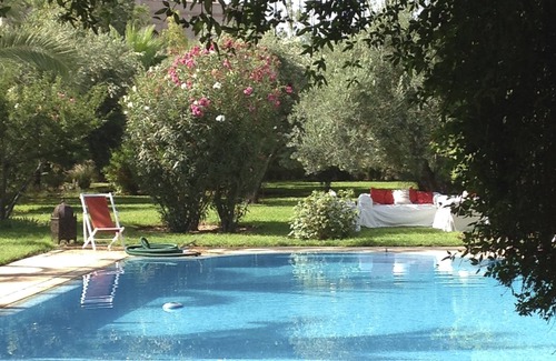 Dar Salma is surrounded by a beautiful garden of one hectare planted with olive trees, date palms, phoenix palms, lemon trees, orange trees and other fruit trees. A beautiful infinity pool of 12 mx 8m is also available to guests. The property consists of a main villa for 6 people and a small adjoining villa, connected by a pergola with flowers for 4 people for a maximum capacity of 10 guests. The reservation of the property is totally exclusive. Each room has a private bathroom and a fireplace. The air - conditioned ensemble is decorated in a Moroccan artisan spirit (tadelakt with walls, ceilings and floors, some reed - roofs "Tataoui" and bathrooms in "Zelliges"). Totally private, the villa is maintained daily from 08H00 to 16H00 by two people and by a gardener. Our cook will be happy to prepare meals at your request and to make you discover the Moroccan gastronomy. Similarly, a Continental and Moroccan breakfast included in your rental will be served every day, consisting of jams "House" ', Moroccan crepes, pastries and freshly squeezed orange juice. There is also a petanque pitch and a table tennis table. Our villa is guarded by a nice dog, we can not accept other animals. Any festive event that may cause nuisance to the neighborhood can not be accepted.