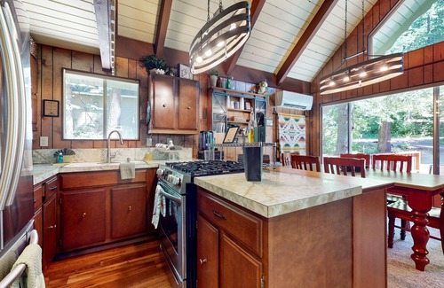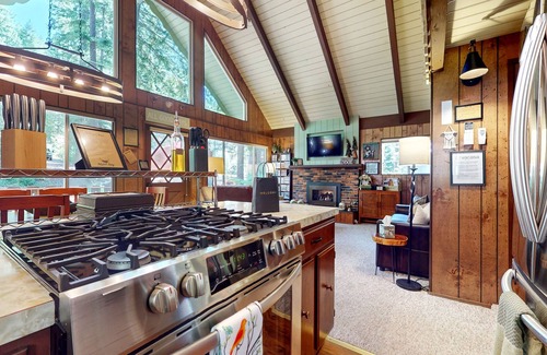 Built in 1977 and full of its original character, the lodge offers several thoughtful updates and features to keep you comfortable in every season. Step inside, set your boots on the rack to dry, and be greeted by wood paneling throughout, two-story ceilings, and a wall of windows that frame the forested neighborhood. The living room, dining room, and kitchen all come together in this open main level, so you can easily spend time with your companions whether you're cooking, sharing a meal, or watching movies on the wall-mounted smart TV (with a DVD player and DVDs) with the gas fireplace heating the entire lodge. The owners love to cook, so the kitchen is outfitted with every essential appliance, tool, and utensil, including a stainless steel French door refrigerator, a gas range, and K-cup, French press, and traditional coffee makers. You can prepare meals indoors with music playing on the Bose speaker or step outside onto the back deck to get the Weber gas grill going. There's ample space to dine in the light-filled dining area and outside on the deck. At night, as the day's clothes and swimsuits refresh themselves in the private washer/dryer, you'll have your choice of one bedroom downstairs and a cozy upstairs loft.