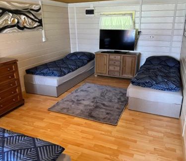 BathroomShower, Toilet, Bathtub or shower, Toilet paperMedia & TechnologyTV, Flat-screen TVKitchenKitchen, Dining table, Refrigerator, KitchenwareGeneralKey access, Trash cans, Heating, Private entranceBedroomWardrobe or closetOutdoorsOutdoor furniture, BarbecueViewGarden viewAccessibilityEntire unit located on ground floorBuilding CharacteristicsDetachedRoom AmenitiesClothes rack |