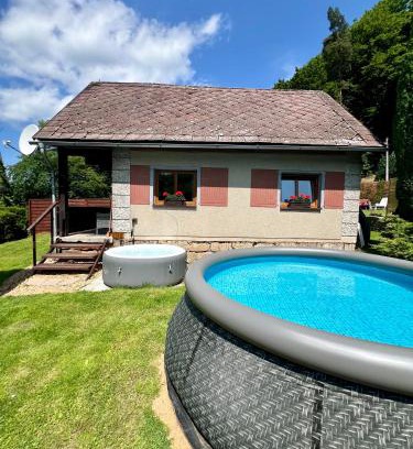 Featuring a garden, Chata v Bučinách features accommodations in Turnov. This property offers access to a terrace, free private parking, and free Wifi. The vacation home has an outdoor pool and a hot tub. The vacation home is composed of 2 bedrooms, a fully equipped kitchenette, and 1 bathroom. A flat-screen TV is available. The accommodation is non-smoking. Ještěd is 24 miles from the vacation home, while Bus Stop Strážné is 31 miles from the property. Pardubice Airport is 65 miles away.