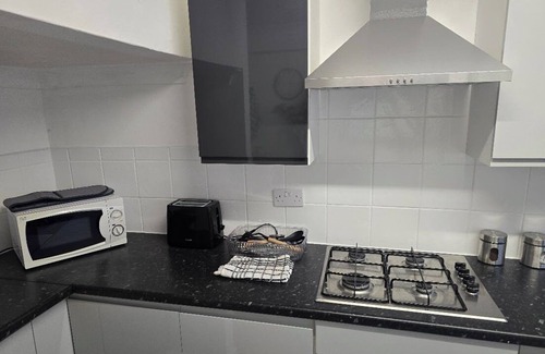 The kitchen has a fridge, a hob, an oven, a kettle, a freezer and a microwave.