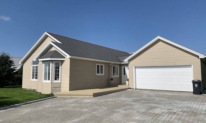 The house is 230 square meters with a large living room, dining area, a fully equipped kitchen, 4 bedrooms each with their own closet and a double bed, a large bathroom with a tub and a shower, a half bath and a washroom with washer/dryer. A large yard surrounds the house including a small patio with a hot tub. The house has a connected garage that has a fully equipped gym for your use.