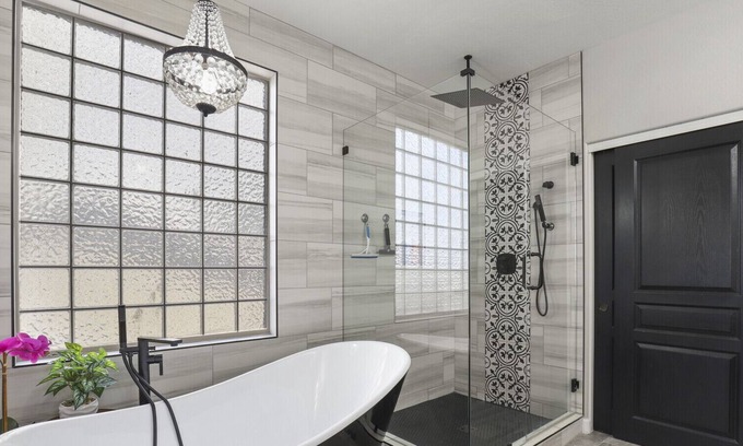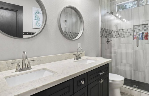 The home features a large driveway & ample free street parking for any cars you may have with you for your trip! Enter directly enter the large living room & high ceilings. There is one bedroom located on the first floor with the other four upstairs, including the master. We've provided tons of board games for any kids you may have with you on your trip along with a poker set for the adults. Backyard features a lovely pool perfect for entertaining the crew and escaping the heat!