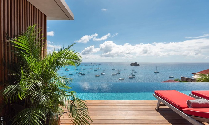 Bianca is ideally located in Corossol. The view of Corossol and Gustavia’s harbour is amazing. It is a contemporary villa, with magnificent wooden architecture. It offers four beautiful bedrooms, all carefully decorated in a sober and elegant style. Two of them are accessible by the kitchen side, with stairs, the two others, by the living side. One is downstairs. You will enjoy the sunsets from the long, heated pool. This is one of our most beautiful villas, one of our very favorite.