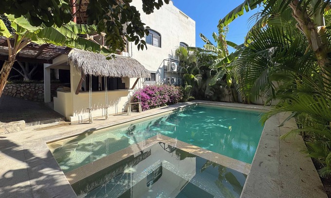 An outside staircase leads to a partially shaded roof terrace with more seating, offering an ideal spot to take in views of the surrounding neighborhood, without ever leaving the property. Down on ground level, the property adds some other surprising amenities, including an extremely private swimming pool and Jacuzzi, almost hidden from the outside as this space is encircled by tropical landscaping and florals. Lounge chairs line the pool, as do two swings. Dine from home, as this space also includes a covered outdoor kitchen, complete with its own thatched wet bar and grill.