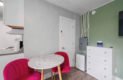 This home comfortably sleeps 2 guests in a luxurious queen size bed fitted with soft blankets and crisp linens for a great night’s sleep. The full bathroom includes a single vanity and walk-in shower.