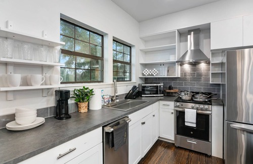 Our kitchen is designed with both functionality and style in mind. It features modern appliances including a microwave, stove, oven, blender, toaster, coffee maker, and dishwasher. You'll find all the necessary utensils, silverware, and dishes for your culinary adventures.