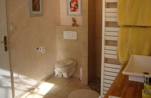 The bathroom comprises of a corner bath, pebbled walk-in shower, two basins and a toilet. There also is a separate toilet accessible from the hall.