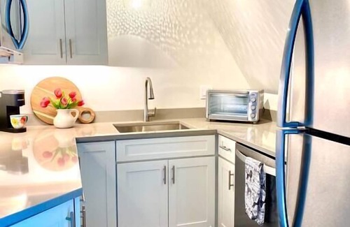 This waterside condo is accessed by one flight of stairs, andoffers two bedrooms (one queen that sleeps 2, and one twin pull-out trundle bed that sleeps 2), a spacious dining and living room, a lovely galley kitchen, and all of the basic amenities to help you feel right at home on the NH seacoast. One note: This unit does not have a cooking stove, but has a toaster oven, coffee maker, fridge, microwave and all of the other amenities for food and bev prep. It's also fully equiped with AC to keep you nice and cool during summer months. We welcome house-trained four legged friends. One parking spot is available directly in front of the condo. Additional parking is available down the street (0.3 miles) at a parking Garage. Guests are granted access to their unit with a smart code key pad. We look forward to welcoming you to the seacoast!