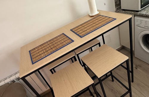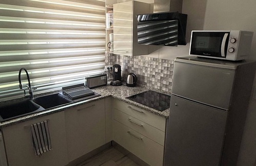 This luxurious, fully air-conditioned apartment features a cozy bedroom with a double bed, a living room equipped with a Smart TV, and unlimited internet access. The American-style kitchen is fully equipped with a refrigerator, stove, oven, microwave, coffee maker, toaster, and kettle, offering all the comforts of home.