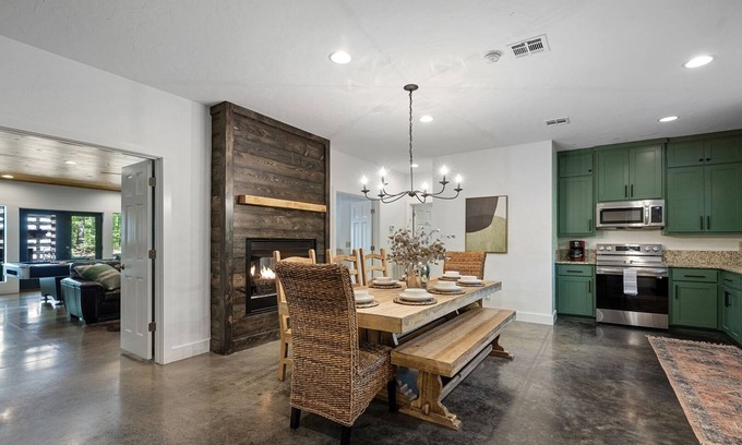 Perfect for families or groups seeking relaxation and recreation, Sagebrush boasts ample space and thoughtful amenities to cater to every need. The focal point of the cabin is its inviting communal areas, where laughter and conversation flow freely. Gather around the farmhouse dining table, illuminated by the warm glow of a double-sided fireplace, for shared meals and cherished moments.