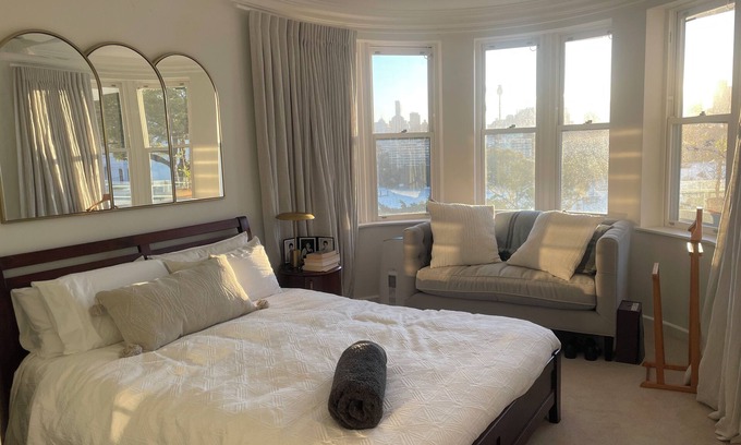 Perfect Sydney Harbour views including the iconic Sydney Harbour Bridge from your luxury master bedroom and comfortable living room. Covered outdoor balcony facing Sydney Harbour with 180 degree views of the water, boats and Sydney Harbour Bridge. The prefect spot for dining with a balcony table that seats 8 people comfortably. Incredible 180 degree views of Sydney Harbour including the Harbour Bridge, All of the home comforts including designer touches: Coco Republic furniture, Villeroy and Boch dinnerware, and Riedel glassware, Egyptian cotton sheets1000+ thread count. Original evocative art deco bathrooms add ambience and warmth to the apartment .Just a short walk to Darling Point ferry walk to catch Sydney Harbour ferries. A short walk to bus and train. An easy stroll to cafes and shops at Double Bay and Rushcutters Bay, Potts Point and the city. Blackout curtains for a good night's sleep. Laundry facilities inside the apartment. Close to Bondi Beach.