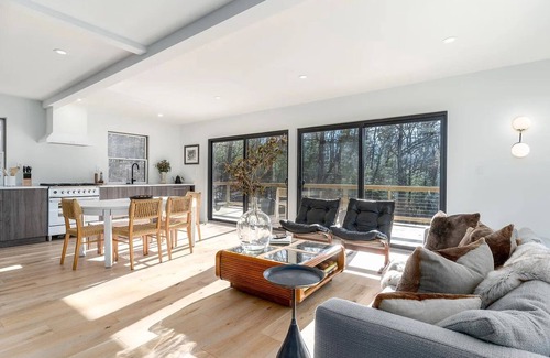 Chic stream-side chalet with mountain view and luxe design in Upstate New York. Nestled on four secluded acres of property featuring a hot tub, outdoor fire pit, and grill in a completely private setting.
