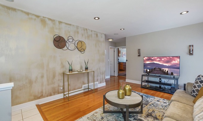1800 SF renovated unit in the North suburbs, and only 20 minutes to Downtown Chicago! This property has 4 bedrooms, & 2 bathrooms. Master bedroom has a KING and 3 bedrooms have a Queen! The living room has room for 1 air mattress (Total of 5 beds). Plenty of Kitchen utensils, all you need in a kitchen, including cooking spices and oils! Children friendly & lots of technology!