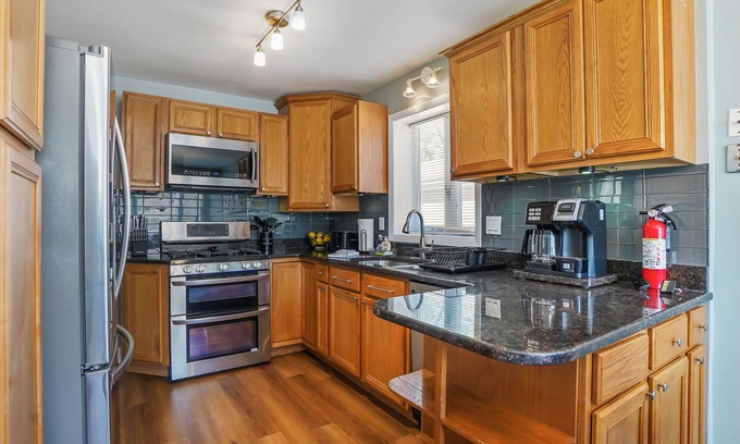 1800 SF renovated unit in the North suburbs, and only 20 minutes to Downtown Chicago! This property has 4 bedrooms, & 2 bathrooms. Master bedroom has a KING and 3 bedrooms have a Queen! The living room has room for 1 air mattress (Total of 5 beds). Plenty of Kitchen utensils, all you need in a kitchen, including cooking spices and oils! Children friendly & lots of technology!
