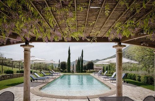 Chiesa del Carmine is a stunning 11th century church and 18th century farm house restored in 2012 as a beautiful 14 bed country house nestling amongst hills in a peaceful valley, surrounded by meadows, woods, vineyards and olive groves. It is reached via a ‘strada bianca’ – white (unmade) road – and is approximately 1 kilometre from the main road. The views from the church and house are beautiful. There is an atmosphere of peace and quiet although the property is not isolated. The property is divided into two structures, the first the ancient church and the second the farm house. The ancient church features a large well equipped kitchen, a dining room and a large drawing room in the main section of the church. The restored farmhouse features eight bedrooms and six bathrooms: four ensuite double bedrooms, two double rooms and two single room which share two bathrooms. Wonderful landscaped garden, with a large swimming pool, pergolas, fountains and numerous terraces.