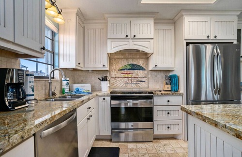 Enjoy captivating water views at every turn, from the bay to the canal. With two decks, including one overlooking the canal, you'll find the perfect setting for outdoor dining, while indoors, a generous table and kitchen island, both seating six, provide ample dining space. Indulge in entertainment with five smart TVs placed throughout the home, ensuring everyone's favorite shows are covered. For relaxation, the living area offers abundant comfortable seating amidst high ceilings, walls of windows, and French doors that enhance the open and airy ambiance. The well-equipped kitchen, adorned with a lively tiled backsplash, invites you to prepare delightful group meals.