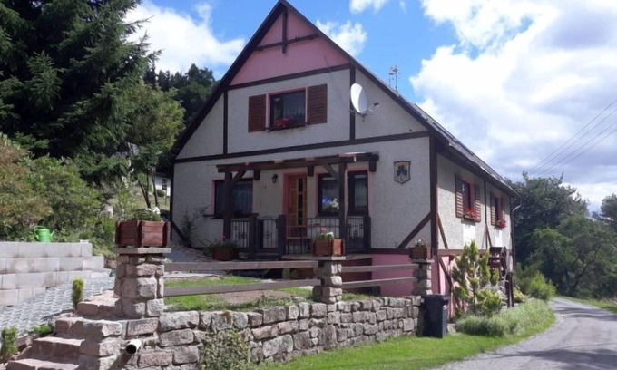 Chlívce 8 km from Hronov: Cosy country house "Chlívce u Hronova", 2 storeys, detached. Outside the resort, in a quiet, elevated position. For shared use: property 1'000 m2, swimming pool round (4,60 m diameter, seasonal availability: 01.Jul. - 31.Aug.). Arbour, garden furniture, barbecue, fireplace, barbecue house, children's playground, parking at the house. Shop 3.5 km, shopping centre 8 km, restaurant 250 m, bus stop "Chlívce" 500 m, railway station "Hronov, Červený Kostelec" 8 km, outdoor swimming pool 9 km, indoor swimming pool 35 km, natural swimming pond 4 km. Ski lift, slopes 200 m, cross country ski track 10 m. Nearby attractions: Muzeum Aloise Jiráska/Hronov 8 km, Adršpašsko-teplické skály 17 km, Broumovské stěny, Náchod 17 km, Ratibořice a Babiččino údolí 20 km, Broumov 28 km, Relaxpark Pec pod Sněžkou 50 km. Well-known ski regions can easily be reached: Radvanice 10 km, Petřikovice 16 km, Mladé Buky 34 km, Janské Lázně 40 km. Well-known lakes can easily be reached: vodní nádrž Rozkoš 25 m. Children's house in the garden. It is possible to arrange meals in a private club, which is at a distance of 250 m (on request). This cottage can be rented as a whole house or separately as 4 fully equipped apartments in the low season.